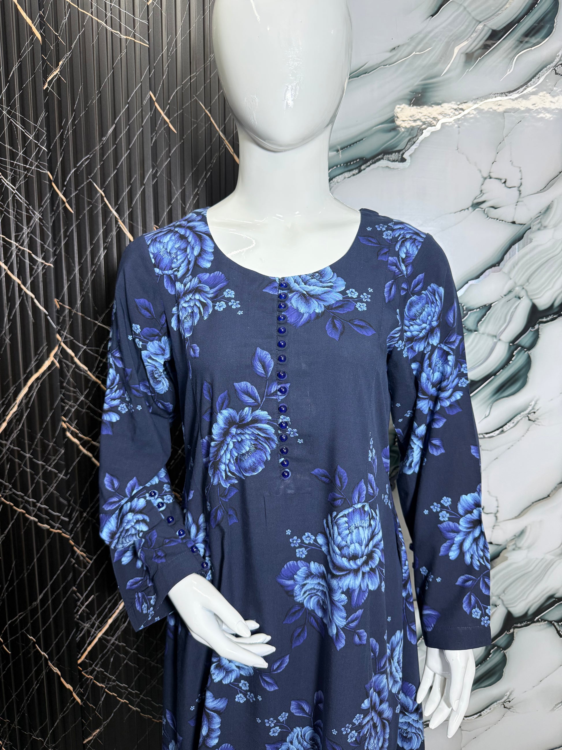 The deep navy blue base is beautifully enhanced with soft blue floral prints, creating a graceful and timeless look. The flowing silhouette falls effortlessly, giving a flattering drape that suits all body types. Delicate detailing on the neckline adds a subtle charm, while the full sleeves provide a modest yet stylish appeal.